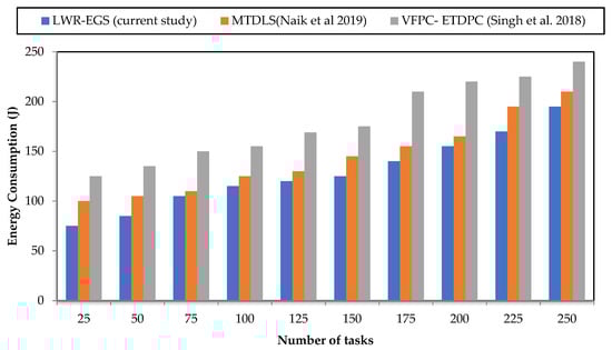 Figure 3 represents the number of tasks in the range of 25 to 250. Here, the task refers to the different indicator category obtained from a Kaggle dataset. On the other hand, the y-axis represents the different energy consumption levels obtained at the different time intervals for the different sets from the indicator categories. When considering the 75 number of tasks, the energy consumption of the LWR-EGS method, MTDLS method and VFPC-ETDPC method is 105J, 110J and 150J respectively.