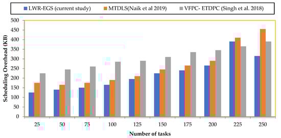 Figure 5 illustrates a graphical representation of the scheduling overhead using the LWR-EGS, MTDLS and VFPC-ETDPC methods. When considering the 225 number of tasks, the scheduling overhead using MTDLS and VFPC-ETDPC methods were 390 KB, 410 KB and 365 KB, respectively.