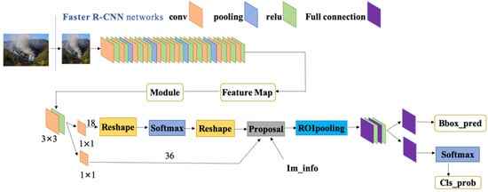 The optimized Faster R-CNN network is shown in Figure 2. We used ResNet50 as the backbone as ResNet50 has more convolutional layers and residual structure, which can merge more feature information and learn more effective feature information with higher dimensions. The model uses the Region Proposal Network (RPN) [14] to generate candidate regions that are input into the pooling layer with the feature layer to achieve convolutional layer feature sharing. The actual candidate area was obtained by regression of the anchor box, and the anchor box of fixed size corresponded to the receptive field of the corresponding size. To ensure the universality of the target detection results, the anchor box was typically set to 128 × 128, 256 × 256, and 512 × 512 to adapt to targets of different sizes; in addition, scale ratios of 1:1, 1:2, and 2:1 were used to adapt to objects with different shapes. After anchor boxes had pre-defined scales and aspect ratios, the first step of the training sample generation process was to filter out the anchor boxes that exceeded the image boundaries. For the remaining anchors, positive samples were those with Intersection Over Union (IOU) overlap ratios with ground-truth bounding boxes higher than 0.7. Next, 256 anchors were randomly selected from the positive and negative samples to form a minibatch for training.
