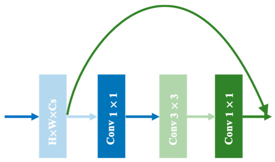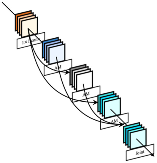 In this study, a method was proposed in which the component perception modules are used to integrate environmental information into receptive fields. Specifically, the component perception module was used to extract the characteristic information of each area block. This module can expand the receptive field and therefore capture more environmental information. Figure 3 shows the RPN structure after inserting the sensing component, where Awareness Module (AM) is the component sensing module as shown in Figure 4. The AM module used an attention mechanism to focus on the characteristics of the object while considering environmental information. This study first used a 1 × 1 convolution kernel to reduce the dimensionality. To improve the speed, a separable convolution method was used, and the convolution kernels were hi ×1 and 1× wi respectively for convolution operations. Finally, the convolution operation with the convolution kernel of 1 × 1 was used again to increase the feature dimension to the original dimension, and the final result was outputed by element-wise summation with the original input. Therefore, the overall structure was residual. This enabled the environmental information to be integrated into the expression of regional features to further enhance the network’s ability to extract target features.