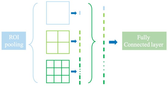 We used the idea of the spatial pyramid pooling structure [15]. In Faster R-CNN algorithm, the multi-level ROI Pooling layer optimization is applied after the convolutional layer and before classification and regression, and its function is to generate a recommended feature map with fixed size and obtain fixed output data as the input of the fully connected layer. As there are two rounds in the ROI pooling layer, pixels are lost in some areas, which causes deviation in the position of the suggestion frame and affects the accuracy of the fire smoke detection results. A spatial pooling pyramid was introduced to divide the candidate frame into regions (such as 1 × 1, 2 × 2, and 3 × 3) in different spaces and then connect them into a single vector for output. Figure 5 is a schematic diagram of spatial pyramid pooling. Spatial pyramid pooling can take both coarse-scale and fine-scale information into account simultaneously, thus avoiding the deviation caused by the double rounding of the single-level ROI pooling layer and improving the accuracy of fire smoke detection. At the same time, the spatial pooling pyramid is more robust to deformable and variable-scale features.