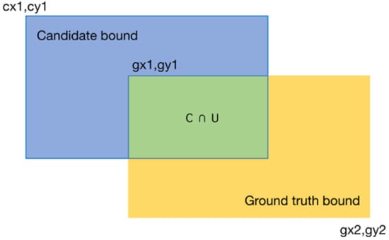 Intersection Over Union (IOU) is the most commonly used evaluation index in the object detection field and is used as a standard for measuring the accuracy of detecting corresponding objects in a specific dataset. IOU represents the overlap rate between the candidate box and the ground-truth bound, namely the ratio of their intersection and union. Higher intersection ratios correspond to higher correlations. Figure 6 illustrates the cross-to-bin ratio.