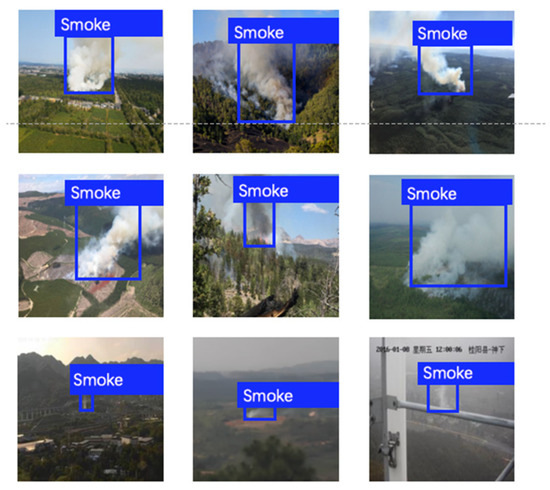 With the fast development of artificial intelligence technology, image recognition technology based on machine learning has been broadly applied to smoke recognition. Wang Tao et al. [5] used a method that combined traditional manual feature extraction and CNN’s automatic extraction of smoke image features. The recognition accuracy of the method reached 92% and the false alarm rate was 3.3%. Yin et al. [6] developed a deep normalized convolutional neural network for fire smoke detection, which used a batch of normalization methods to accelerate the training process and enhance the accuracy of smoke detection. Various target detection models such as Denet [7], Light-Head [8], Yolo-V3 [9], and Faster R-CNN [10] have been applied to forest fire smoke detection. Zhang et al. [11] used Faster R-CNN to detect wild forest fire smoke by inserting both real smoke and simulated smoke into the forest to generate synthetic smoke images, which could not only avoid the complicated artificial feature extraction process but also ease the training data and avoid the problem of scarcity. Lin et al. [12] developed an improved smoke recognition model with non-maximum annexation based on Faster R-CNN and 3D CNN, which achieves fire smoke recognition by combining dynamic spatiotemporal information. The recognition accuracy of the smoke video was 95.23%, and the false alarm rate was 0.39%. Li et al. [13] applied Candidate Smoke Region Segmentation and the proposed wildfire smoke dilated DenseNet (WSDD-Net) to forest fire smoke detection, which realized a high AR of 99.20% and a low false-negative rate (MA) of 0.24%. The above fire smoke recognition model achieved higher recognition accuracy and a lower false-negative rate than traditional machine vision algorithms. With the rapid development of science and technology, the field of target detection has become increasingly applied to species recognition. However, slow recognition speed and low recognition efficiency are still bottlenecks that need to be further resolved. With the continuous development of the forest fire smoke recognition algorithm, it is found that the background of the image has a certain impact on the accuracy of algorithm, but most of the current algorithms have not incorporated more background to improve it.