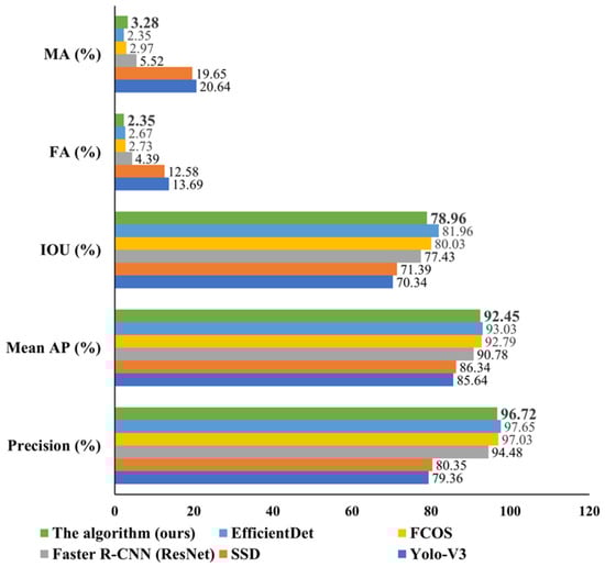 To verify the superiority of the forest fire smoke recognition model proposed in this article and compare it with the recognition effects of two commonly used target detection models (Yolo-V3 and SSD) and the latest target detection models (FCOS and EfficientDet) with Faster R-CNN, 1110 images of fire smoke at different viewing distances in the dataset PART 3 were selected. The focal image and 430 interfering images, such as clouds and fog, were used as identification objects. Figure 8 shows the comparison of the recognition effects of these three models. Several of the relevant findings are detailed below.