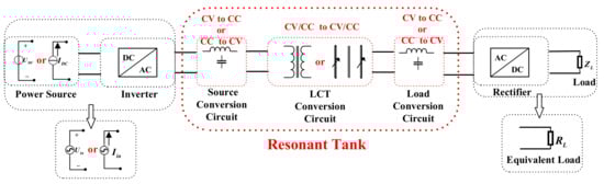 In order to achieve load-independent constant-voltage or constant-current output from the AC source to the equivalent resistance, the design of compensation circuits is divided into three sections as displayed in Figure 3: source-side conversion circuits, load-side conversion circuits, and LCT conversion circuits. Both source-side and load-side circuits are designed to convert voltage to current or convert current to voltage. The LCT compensation models can realize the conversion of voltage and current in four forms: CV input to CV output, CV input to CC output, CC input to CV output, and CC input to CC output. It is clear to see that by properly combining four types of the LCT models with the source-side and load-side conversion circuits, we can realize the load-independent CV or CC output from voltage/current source to load.