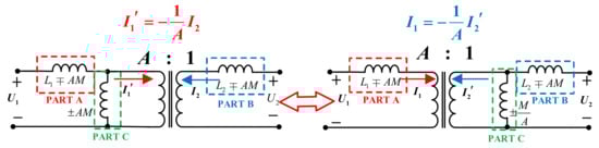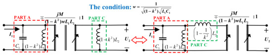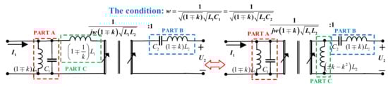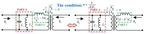 Based on the current–voltage conversion and impedance conversion relationships of the ideal gyrator, we can prove that the loosely coupled transformer can be converted into the model in Figure 10. The two circuits in Figure 10 are equivalent due to (8). As shown in Figure 10, Part A is a series inductor for the primary circuit, and its value is . Part B is a parallel inductor for the secondary circuit, and its value is . Part C is a parallel inductor with a value of at the primary side or a series inductor with a value of at the secondary side.