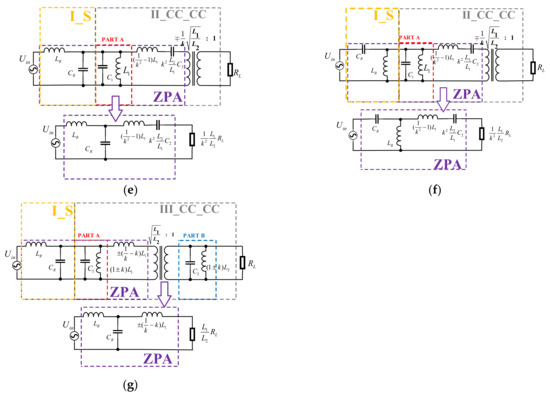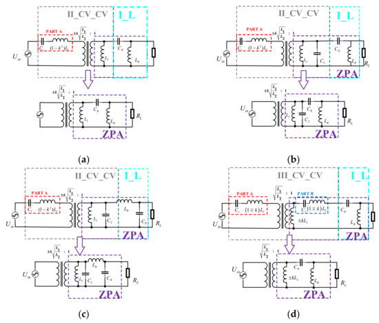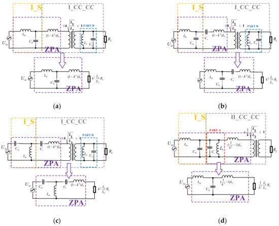 The third type (CV_CV_L): As described above, the CV_CV model has three types, and the load conversion circuits have two options. Four novel compensation topologies are designed as shown in Figure 26: namely, S/LC, S/LCC, S/CLC, and S/LC. The above compensation topologies of ZPA implementation conditions can be converted into the circuits shown in Figure 25b and Figure 26. The Y parameter matrix corresponding to the two-port network in the blue box is . Then, the port input impedance is . Similarly, the ZPA realization conditions are
