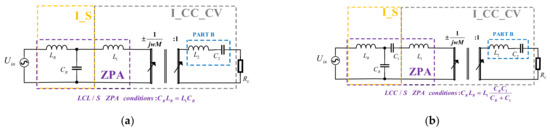 The first type (D_CV_CC): The voltage source cannot drive the parallel topology [6]; therefore, the I_CV_CC model cannot be directly used to achieve constant voltage to constant current from the source to load. In order to achieve ZPA characteristics, the compensation capacitor can be connected in series on the secondary side of the II_CV_CC/III_CV_CC model, as shown in Figure 23. The ZPA realization condition is