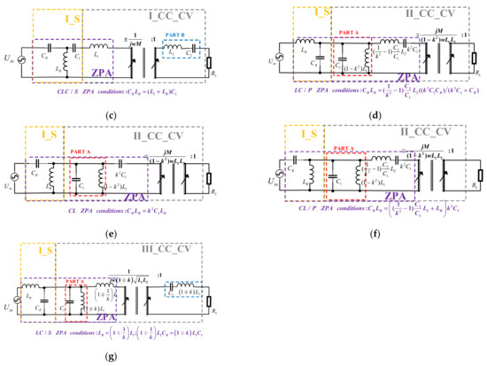 The S_CC_CV compensation topologies: (a) LCL/S [22]; (b) LCC/S [6,15,16,17,31,32]; (c) CLC/S; (d) LC/P; (e) CL; (f) CL/P; and (g) LC/S [12].