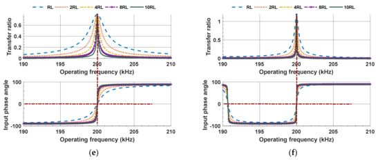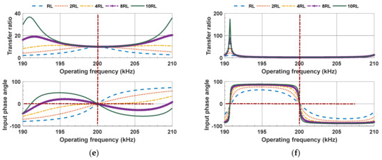 In this section, the novel compensation topologies with constant-current output characteristics including LC, CLC/S, S/LC, S/LCC, S/CLC, and S/LC circuits are simulated to verify the ZPA and constant-current output characteristics. The mathematical model of the above compensation topologies is established in MATLAB for simulation. For all the compensation topology, the simulation conditions are the same, including the inductance of the primary and secondary coils which are 6.71 μH and 6.68 μH, respectively. The coupling coefficient k is 0.1, the operating frequency of the circuit system is 200 kHz, and the load resistors RL ranges from 100 Ω to 1000 Ω. The parameter designs of compensation topology are referred to Table 3. The transfer ratio of the above compensation circuits and the phase-frequency characteristic curve of the input impedance obtained by simulation are shown in Figure 30. It can be seen that only the input impedances at the fully compensated frequency (200 kHz) are purely resistive. In addition, the transfer ratio corresponding to this point is independent of the load value, which verifies the theoretical analysis and the designed parameters shown in Table 3.