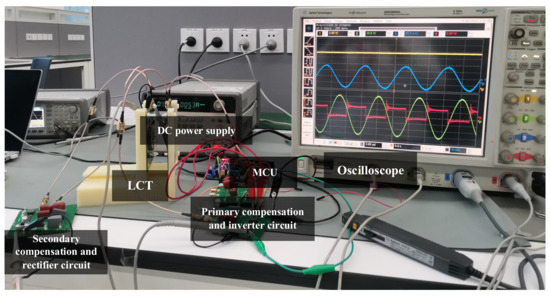 In order to further verify theoretical analysis, a S/LCC compensation network in an IPT system is constructed as shown in Figure 32 and realized on the printed circuit board (PCB) as shown in Figure 33. Q1~Q4 are primary-side power MOSFETs that constitute a full-bridge inverter. L1 and L2 are the self-inductances of primary and secondary coils, respectively. The values of L1 and L2 are fixed at 6.97 μH and 6.98 μH, respectively. C1 is the series compensation capacitor of the primary side. C2, CR, and LR are the series compensation capacitor, the parallel compensation capacitor, and the series inductor of the second side. D1~D4 are the rectifier diodes at the secondary side that form a full bridge rectifier. CRec is the filter capacitor, and RL is the practical load. When the distance between the two coils is 3.5 cm, the coupling coefficient is measured as 0.1. We selected the resonant frequency of 200 kHz and the values of LR to be 1.44 μH and designed the values of compensation capacitors according to Figure 29b and Table 4. The measured values of compensation capacitance and other circuit parameters are shown in Table 5.
