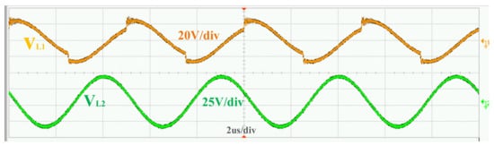 Figure 34 is the voltage waveforms of the primary coil and the secondary coil. Figure 35 shows the waveforms of the inverter output voltage VAB and current IAB. It can be seen from the Figure that the phase of VAB and IAB are basically the same. The experimental results of inverter output voltage VAB and transmitter coil voltage VL1 are shown in Figure 36. The phase difference between VAB and VL1 is 90°. The above two experimental results both prove that the system achieves ZPA characteristics.