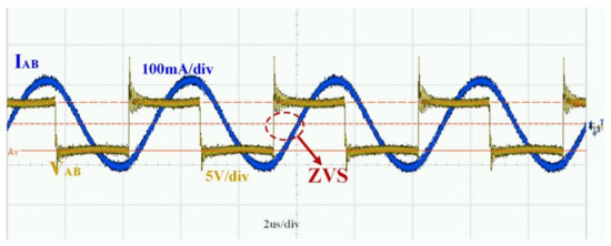 As mentioned in Section 1, in order to achieve soft switching, the circuit should be slightly inductive. When the C1 is adjusted to 101.16 nF, the measured VAB and IAB are shown in Figure 37. It can be seen that the phase of the voltage leads the current by about 30°, and the circuit realizes the ZVS characteristic.