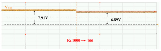 Figure 38 shows the output voltage waveform of the system when the load is suddenly changed. When the load resistance RL drops suddenly from 1000 Ω to 100 Ω, the voltage on the load drops from 7.91 V to 6.89 V. When the load resistance is 100 Ω, the system efficiency is 88.6%. When the load drops by 10% on average, the output voltage only decreases by 1.42%. Therefore, the system can still be regarded as a constant-voltage output system. Although the theoretical analysis proves that the load voltage does not change with the change of the load resistance, it should be noted that the theoretical analysis did not consider the influence of factors such as parasitic resistance and parameter errors in the real system. In addition, the simulation proves that if the series resistances of the coil and the capacitor and the on-resistances of the power MOSFETs are considered, the resistance voltage changes slightly with the change of resistance. Therefore, the constant-voltage characteristic of S/LCC compensation topology is significantly improved if devices with higher accuracy and smaller parasitic resistances are used.