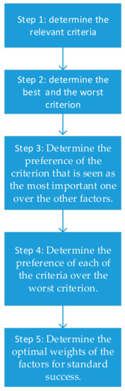 The (linear model) best–worst method (BWM) [34,35] was applied to determine the criteria weights. This method uses pairwise comparisons to arrive at weights for factors. This method was chosen because it leads to more reliable results than other methods [34]. Another advantage over other methods is that fewer comparisons are required. The BWM consists of five steps (the description is applied to the case under investigation):