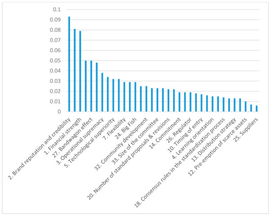 The factor “financial strength” was the third most important factor (0.079). Without continuous investments in developing a standard, companies cannot sustain themselves in the market [41,42]. Therefore, to realize success with the standard, continuous investments in, for example, establishing a charging infrastructure are needed. One of the experts argued, “You need deep pockets to provide these services” [39] (I10, 2020). Financial resources can also be used as a tool for lobbying to gather “more support from other players in the market” [8,56]. While there is competition in the market between the charging standards, having V2G capability can provide a competitive advantage to either of the charging standards. Therefore, one of the experts mentioned that, “The financial strength is absolutely important when we get a bit of competition in this field” [8] (I1, 2020).