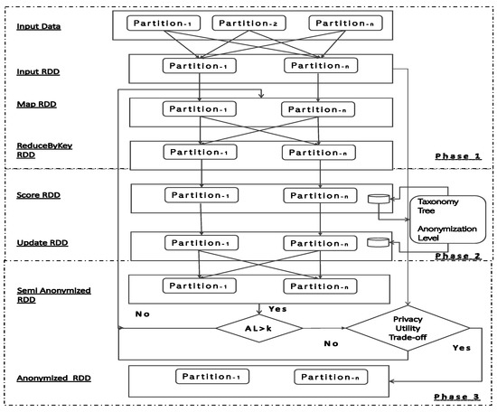 In this section, we provide a detailed description of our proposed approach for Spark-based subtree anonymization. Our proposal consists of three phases, where each phase output is required as an input for the next phase. We inherit the application of Spark Resilient Distributed Dataset (RDD) design and data partitioning mechanism for our approach and describe the step by step data flow to address the concerns discussed in Section 3.3. We robust our approach by segregating the computation of data anonymization using Figure 3 illustration. We discuss the details of each phase and the specific improvements we have made to resolve MapReduce-based issues in the following three phases: