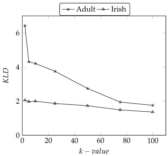 We observed that the overall trends for the to the DM values observed in other similar approaches in [25,51]. As the k-group size increases, more records are part of an , and thus records are less distinguishable from each other. The Irish dataset shows higher DM scores compared to the Adult dataset because there are more chances to make on tuples on the Irish dataset as it contains more distinct qid values. For both datasets, the DM score stays steady which shows low sensitivity to the growth of k-group size (e.g., no more changes in ).