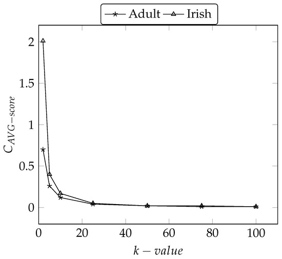 The trend of scores was similar to as both metrics were based on the calculation according to the size of equivalence classes on the number of records in the dataset. The comparison of and scores are very hard to compare the values for Adult and Irish different datasets. At the time of consider the number of records, however, the score does not take into account the records of the dataset [54]. As defined earlier the equivalent class contains the identical number of attributes in a table, the increase in k will increase the for each class. In Figure 14 score for the Irish dataset is significantly different from the Adult dataset, this is because the Adult dataset applies generalization on “Race” , whereas Irish use “Field of Study” for the highest generalization. We observe the number of distance values for “Race” and “Field of Study” are large in the margin as shown in Table 5 and Table 6 respectively. The increase in k increase the accordingly, with the “Field of Study” in Irish dataset changes a large number of the attribute that increases the which impact the and score compared to Adult dataset “Race”. In addition to that, there are 16 in Irish data and 17 in Adult data, once all the are applied for we observe both datasets returns the same utility as observed for the and scores for in Figure 14 and Figure 15.