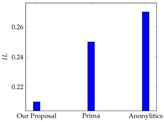 Based on Equation (6), we computed () for single . To obtain the for the entire anonymized dataset (denoted as ), we calculated the for by taking the average of all . The entropy value of is 0 if the records are identical between the original dataset and the anonymized dataset within the matching equivalent class. The maximum value of is achieved when the original record sets are very different from the anonymized record sets for a given . A higher value of represents more uncertainty (i.e., higher privacy).