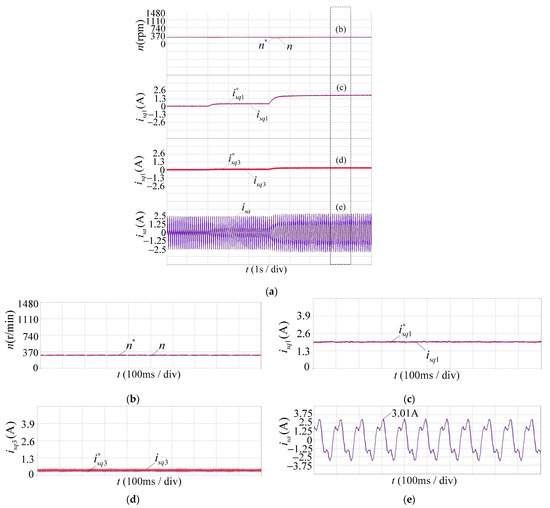 Experimental waveform of model predictive control and field-oriented control (MPC+FOC) system at 300 r/min, showing (a) the whole process; (b) the speed n; (c) the current ; (d) the current ; and (e) the phase current .