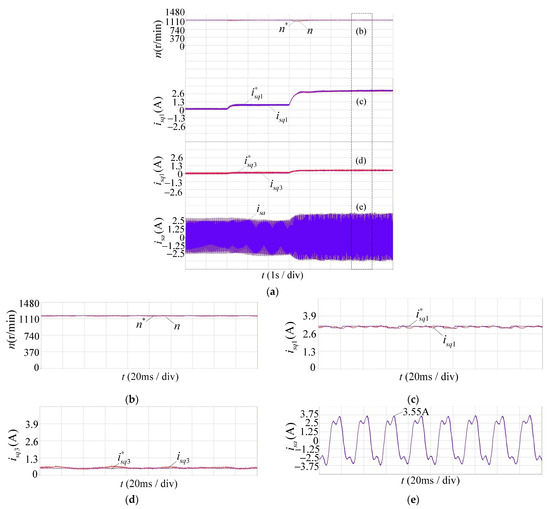 Experimental waveform of the MPC + FOC system at 1200 r/min, showing (a) the whole process; (b) the speed n; (c) the current ; (d) the current ; and (e) the current .