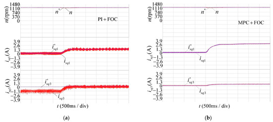 Comparison of two control methods when load disturbance occurs: (a) n, and of PI+FOC; and (b) n, and of MPC+FOC.