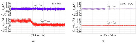 Current tracking error of two control methods: (a) tracking error of and under PI+FOC; and (b) tracking error of and under MPC+FOC.
