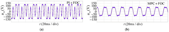 Phase voltage after the filtering of two control methods with a load: (a) phase voltage under PI+FOC at a 2 KHz switching frequency; and (b) phase voltage under MPC+FOC at a 2 KHz switching frequency.