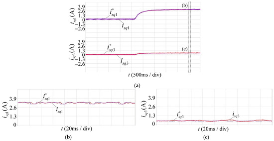 It can be seen from Figure 5a and Figure 6a that when different load torques were applied to the motor at the two speeds, the motor speed, the currents in the fundamental plane and the harmonic plane could all track the given values without static errors. When the motor speed was at 300 r/min, the A-phase current frequency was 10.5 Hz, and the third harmonic phase current frequency was 31.5 Hz, so the fundamental plane and the third harmonic plane of the nine-phase induction motor were both at a normal carrier ratio. When the motor speed was at 1200 r/min, the A-phase current frequency was 41.1 Hz, and the third harmonic phase current frequency was 123.3 Hz, so the fundamental plane of the nine-phase induction motor was at a normal carrier ratio (48.7), and the third harmonic plane was at a low carrier ratio (16.2). These indicate that the proposed MPC algorithm could control the currents both in the fundamental plane and the harmonic plane whether at a normal carrier ratio or a low carrier ratio and track the given values without static errors.