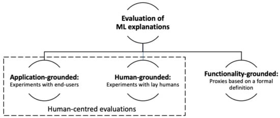 It is argued that two factors determine understandability of an ML system: the features of the ML system and the human’s capacity for understanding []. Understandability is a function of the two factors in combination. Therefore, the involvement of human users is important in the evaluation of ML explanations. A widely cited taxonomy of evaluation from Doshi-Velez and Kim [] divided evaluation approaches into three categories (see Figure 3):