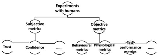 - Objective metrics. This refers to objective information on tasks or humans before, after, or during the task time. Examples include human metrics, such as physiological and behaviour indicators of humans, during ML-informed decision-making, or task-related metrics, such as task time length and task performance [] (see Figure 4). For example, Zhou et al. [] found that physiological signals such as Galvanic Skin Response (GSR) and Blood Volume Pulse (BVP) showed significant differences with the explanation presentation influencing training data points [] on ML predictions, and these physiological responses can be used as indicators of user trust to assess the quality of ML explanations. Based on approaches that quantify response times in user studies as well as agreement between human labels and model predictions [,], Schmidt and Biessmann [] proposed that faster and more accurate decisions indicate intuitive understanding of explanations. A trust metric was then derived based on these explainability metrics.