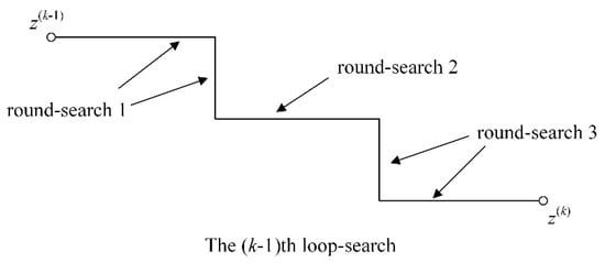 Algorithm 2 ends when finding a better point than the start point of the loop-search, or each in different directions is less than a given small value (the termination tolerance) ε; otherwise, the loop-searches composed of the round-searches go on.