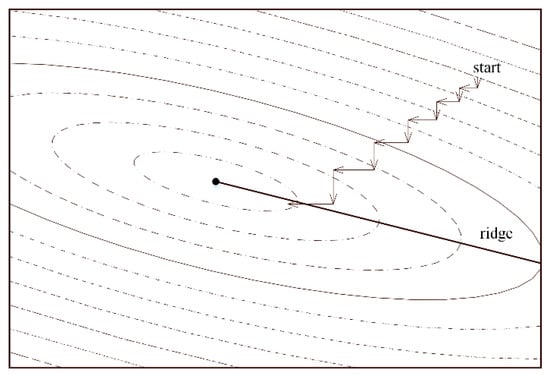 The Rosenbrock method is extremely sensitive to the initial point, and easy to get stuck in local minima in many problems by our experiments, and the iterative othonormalization (rotation) procedure of it is time-consuming, increasing the time complexity [49]. However, through the orthogonal search directions (zig-zags in Figure 3), searching can move near a ridge to reach the optimum, which can adapt itself to the local terrain. Simple and heuristic, it performs better on sharp ridges of functions [11].