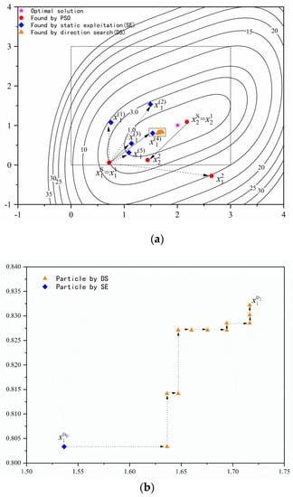 Equation (3) suggests that the particles fly without with inertia. Thus, we call the process “static exploitation” (SE). Where denotes the velocity gained by the t-th SE of the i-th particle at generation n. Because of the decrease of kinetic energy, the particles may exploit a few positions in a small scope around the point . Let T be the maximum exploiting times.