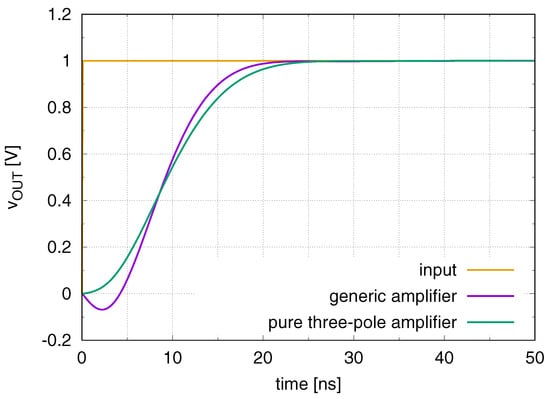 To verify the correctness of our approach, we designed the ideal amplifier in Figure 5 making and and compared its time response to that of an ideal pure three-pole amplifier with the same and designed with and . We expect similar behaviors, i.e., very small NSTs, in the interval 0.4–0.6, for both circuits.