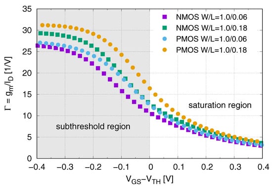 where is the -over- ratio of the input transistors []. The plot of the -over- versus the gate-source overdrive is reported in Figure 7 for two complementary devices of a 65-nm CMOS process. Other nanometer CMOS processes have similar plots with no practical differences compared to the curves in Figure 7 []. Since, in the analog design context, transistors are biased so that , the choice of the -over- ratio has a limited range (typically, ).