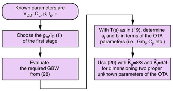 The draft of the proposed design strategy is reported in the flow-chart in Figure 8. More specifically, once that the is determined based on the settling time specification, the designer has two design equations that allows him to set two suitable parameters of the OTA. The remaining parameters can be chosen freely or based on other constraints set by noise, power dissipation or other critical figures of merit that, in general, depend on the application or on the amplifier topology.