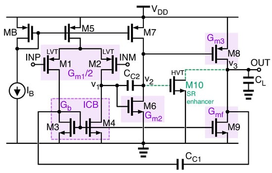 Among the various analog and mixed-signal integrated circuits, the operational transconductance amplifier (OTA) is certainly one of the most fundamental building blocks. Over the past few decades, the approach to their design has changed according to the technological scaling that, in turn, has been driven by the manufacturing processes of integrated circuits (ICs). The lowering of the intrinsic gain in MOS transistors (), the scaling down of the power supply voltage () and the consequent preclusion to the adoption of cascade configurations, moved the interest of the research towards multistage amplifier topologies [,,,,,,,]. In this background, the ‘speed’ of OTAs has been evaluated and compared using the gain-bandwidth product () as the main performance metric.