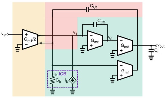 Block schematic of a three-stage OTA compensated with the Reversed Nested-Miller Compensation with Inverse Current Buffer and Feed-Forward stage (RNMC-ICBFF). Referring to the block schematic in Figure 1a, we can identify (1) the block responsible for the dominant pole and the of the amplifier (light-yellow area); (2) the internal block with two real poles (light-green area); (3) the internal feedback across the internal block (light-red area). The overall feedback that will connect the output to the input is not drawn.