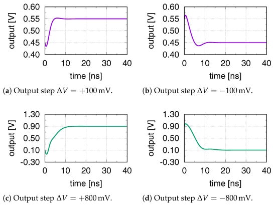 The output step responses of the closed-loop amplifier to different step amplitudes are shown in Figure 13. Figure 13a,b depict the transient behavior of a - output step for the rising edge and the falling one, respectively. The simulated settling-times are () and (), respectively, for an accuracy level of 0.5%. Figure 13c,d show the transient behavior of a ±800-mV output step. In this case, the signal excursion is close to the rail-to-rail situation but still ensuring that no transistor exit from the saturation region. As expected, the slew-rate increases the % settling time up to () and (), for the rising edge and the falling one, respectively.
