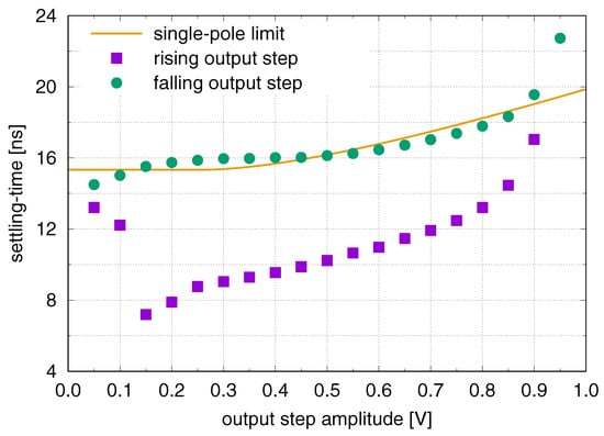 Figure 14 shows the plot of the % settling time versus the step amplitude at the output node. The curve of the single-pole case, evaluated from (22), is also reported. As expected, for the rising edge, the settling time remains well below the single-pole limit up to 0.9 V. Above this value, some transistors enter the triode region, and the settling time goes out specifications. The falling output step suffers from slew-rate limitation at the output node. This is mitigated by the SR enhancer that allows the settling time to follow the single-pole limit up to 0.9 V, also in this case.