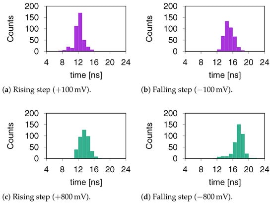 A 400-run Monte-Carlo simulation is performed to estimate how the circuit behaves under both global and local process variations. The results are condensed in the histograms in Figure 15. Figure 15a,b refer to the - output step cases. Figure 15c,d refer to the - output step cases. Except for a small number of samples in the 800-mV falling step case (Figure 15d), all the runs fall inside the settling-time specifications of , a very good result considering that the circuit was not designed to be robust against process variations. However, it is easy to extend the design strategy to the worst-case corner of a PVT scenario or to integrate it with the approach described in [].