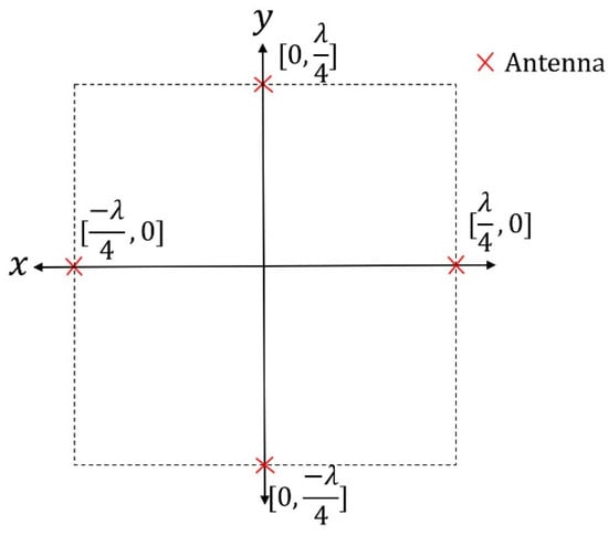 where is the direction (normal) unit vector to , is the complex excitation coefficient, is the added phase component, and is the wavenumber. The accounts for the variation of the power radiated as a function of and (components of in a spherical coordinate system). In the far-field, the radial component of the electric field is zero; receiving antennas have thus only the requirement of being further than where is the largest dimension of the antenna [19]. A reconfigurable antenna array is an antenna with a tunable [24,25,26,27]. Without loss of generality, a straightforward model of reconfigurable antennas is used in this work: a point source isotropic antenna with a tunable phase. For an isotropic antenna, the radiation intensity is constant in all directions. The only difference between each antenna element will be their relative position in the space and the added phase component.