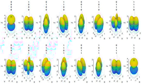 As shown in Figure 2, the full spherical space is considered () with a high resolution () to reconstruct the radiation symbols. By inspection, only six out of the sixteen states from Figure 2 are unique. The level of uniqueness is quantified by the degree of linear independence or orthogonality between each pair of symbols. To quantify this, we consider a procedure to determine the linear independence of radiation pattern symbols according to the number of elements of the array, their position in the plane, and the phase shift each element introduces. The linear independence will be determined using the Euclidean distance between a pair of radiation patterns as a figure of merit. A higher distance will represent a higher level of independence, reducing the risk of error in a noisy channel. Each radiation pattern is a point in the Euclidean space, i.e., ; the Euclidean distance is then defined as