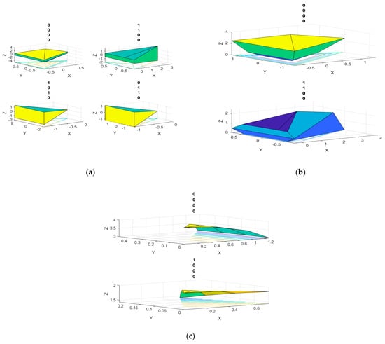 As is depicted in Figure 4, the resolution, space, and threshold restrictions in multiple orthogonal radiated symbols are shown. In Figure 4, the symbols obtained for and the three considered fractions of the space are shown. The spatial restrictions used for the case of Figure 4a resulted in four different radiation symbols (2 bits), while for the cases considered in Figure 4b,c, only a pair of symbols is obtained for each (1 bit). A proper selection of the resolution and the space considered can lead to a higher number of successfully transmitted bits, as is the case in Figure 4b, where measuring half the space is preferred in terms of the orthogonality between symbols.