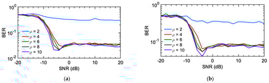 Simple slow fading and attenuation models can be immediately included in the model using the multiple techniques described in [32]. Figure 6 presents the effect of two channel effects shown for the case considered in Figure 5b. For an arbitrary shadow fading modeled as Gaussian normalized variable , the BER poorly performs as shown in Figure 5a. Even more, a rain attenuation factor can be easily included using, for example, the models given in [33,34]; assuming a 1.5 dB rain attenuation for a specific distance, geographical location, and rain rate, the BER is further deteriorated (Figure 6b). The system operates poorly if an obstruction or attenuation is added when only two symbols are considered, as in the previous case. The system relies entirely on a static collection of symbols, with a high or low degree of orthogonality between them; an obstacle can quickly deteriorate the orthogonality between them. A designer can either increase the symbols’ orthogonality or, preferably, use an adaptable methodology capable of dealing with the sudden changes in the wireless channel. Once the possible applications for this communication technique are given, specific models can be created to account for each of the different wireless channels’ particular difficulties.