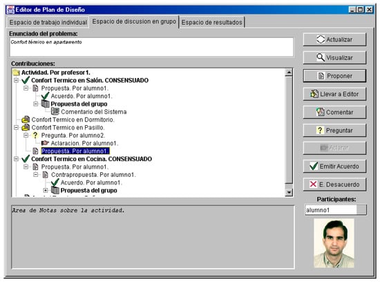 Collaborative learning systems are divided, in one of their most commonly used divisions, into asynchronous and synchronous. Asynchronous tools are used at different times by the participants in the interaction. A typical example of this kind of system is email. In this type of application, users utilize the tool at different times to send messages to each other, and it is not necessary to reply immediately to the received email. When the email account is opened, they can answer the received emails immediately. By not having to reply in real time, the user can think about how to respond to the asynchronous proposed action. Asynchronous tools, therefore, are used in many cases to plan solutions to complex problems in e-Learning systems, in many cases requiring artificial intelligence mechanisms. As an example, we can propose the PlanEdit tool [4] (see Figure 1), which was developed by students to solve domotics problems within the DomoSim-TPC (Domotics Simulation—Telematic Planned Collaborative) system [5]. In this case, the student solves a planning problem where they can be tutored by artificial intelligence mechanisms. In this asynchronous system, the students select actions individually in the "Individual Workspace", which are then shared in a "Collaborative Workspace" where they discuss possible solutions. When they reach a consensus, and if the solution testing mechanisms used by artificial intelligence are in accordance with what was planned, the proposal is moved to the so-called "Results Space". If the discussion in the collaborative space is too long, the system can suggest changes according to the level of scaffolding that the problem allows. The scaffolding helps the student more in the initial problems, even if they are easier, and less in the later problems presented, even if they are more difficult. In this way, help is offered according to the level of knowledge acquired by the student.