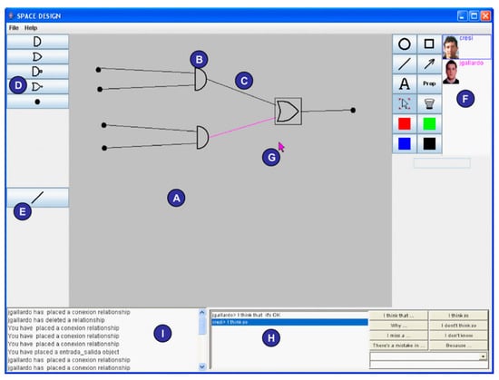 The ad hoc implementation of collaborative systems is an arduous task. This is why the automatic or semi-automatic creation of groupware applications is useful for the generalization of their use in classroom. The automatic creation of synchronous applications for both CSCL and Computer Supported Cooperative Work (CSCW) environments is vital to developing useful tools in a reasonable time. In this case, a model-driven engineering (MDE) method has been designed for the development of domain-independent collaborative modelling systems [10]. Figure 5 shows an application generated using the SPACE-DESIGN tool in order to allow the participants (with their picture on the right of the system in F) to generate diagrams in a collaborative way. Figure 5 also shows a shared whiteboard (A) where two participants can add elements from the application domain, in this case logic gates. Entities (B) and relationships (C) can be added and appear on the left in the environment (D, E). The telepointers (G) are used to show the area of the shared whiteboard where each participant is editing. This environment has been developed by defining models that automatically generate the final environment in Figure 5.