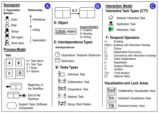 CIAM (Collaborative and Interactive Application Methodology) is complemented by a notation called CIAN (Collaborative Interactive Application Notation) [15]. A summary of the CIAN is shown in Figure 7. In areas A and B, we can see the icons that represent the nodes that constitute the process model, the relationship types which indicate the different tasks, and the interdependence types. In C, we can see the icons used to represent an interaction task model in CTT notation.